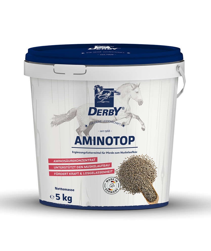 Standardowe racje żywieniowe dla koni sportowych lub hodowlanych dostarczają zazwyczaj zaledwie kilka aminokwasów- w zależności od wysokości i jakości składników zawartych w paszy podstawowej. Z kolei DERBY Aminotop uzupełnia dietę konia w cały szereg niezbędnych aminokwasów ważnych dla prawidłowego funkcjonowania organizmu.