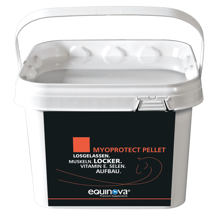 EQUINOVA Myoprotect Pellet wspiera metabolizm mięśni. Podczas intensywnego wysiłku fizycznego komórki mięśniowe są szczególnie narażone na uszkodzenia przez wzrost wolnych rodników w organizmie. Połączenie witaminy E i selenu wspiera funkcje komórek mięśniowych i aktywnie je chroni przed bolesnością i sztywnością mięśni. Zawarte w preparacie aminokwasy wpływają korzystnie na rozbudowę i regenerację masy mięśniowej.