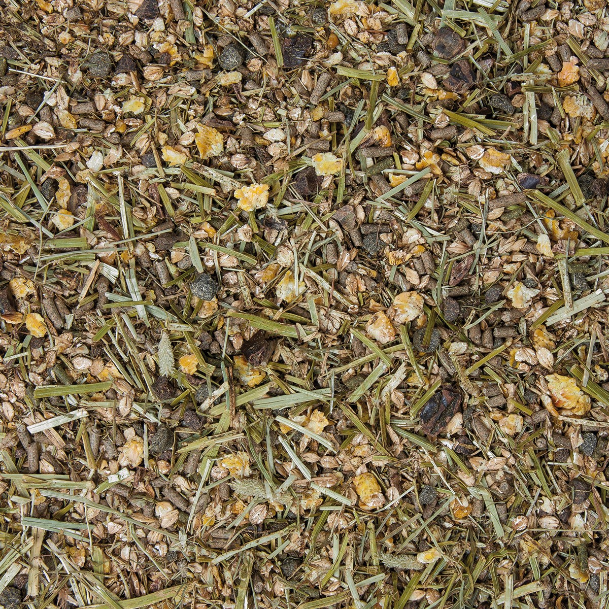 Płatki jęczmienne, płatki kukurydziane, łuski nasion słonecznika, lucerna, poekstrakcyjna śruta słonecznikowa, pszenica drobno mielona, wytłoki z jabłek, chleb świętojański, tymotka łąkowa, drożdże piwne, pulpa z cykorii, węglan wapnia, olej lniany, jęczmień, chlorek sodu, śruta poekstrakcyjna lniana, fosforan jednowapniowy, olej słonecznikowy.
