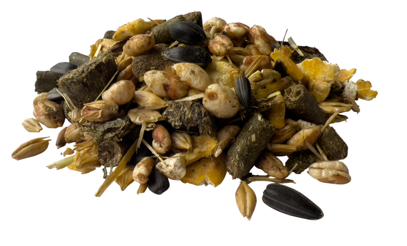 Płatki jęczmienne, płatki kukurydziane bez GMO, trawa tymotka, siano (płatki), płatki z nasion lnu, topinambur (fermentowany), jęczmień prażony, otręby pszenne, czarny owies, słoma pszenna, nasiona słonecznika czarnego, kukurydza prażona bez GMO, drożdże browarniane, węglan wapnia, chlorek sodu, tlenek magnezu, drożdże (Yea Sacc).